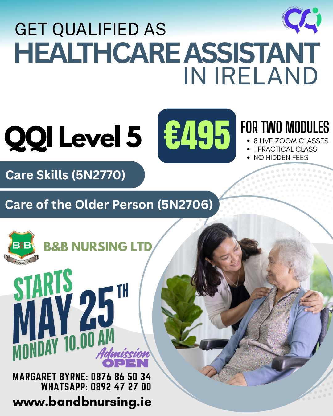 അയർലണ്ടിൽ ഹെൽത്ത് കെയർ അസിസ്റ്റന്റ് ആയി ജോലി ചെയാൻ QQI Level 5-ൽ ഉള്ള രണ്ടു മോഡലുകൾ എങ്കിലും പാസ്സ് ആയിരിക്കണം. അയർലണ്ടിൽ സ്റ്റുഡന്റ്‌ വിസയിലുള്ള മലയാളികളടക്കമുള്ള പലരും ഒരു ഫ്ലെക്സിബിൾ പാർട്ട് ടൈം ജോലിക്കായി കഷ്ടപ്പെടുന്നവരാണ്. ഇവർക്കായി QQI Level 5 Care Skills (5N2770), Care of the Older Person (5N2706) എന്നീ മൊഡ്യൂളുകൾ മെയ് 25ന് ആരംഭിക്കുന്നു.